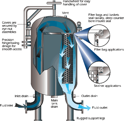 【原理】要过滤的液体从被支撑网篮支撑的过滤袋顶部注入,这使得液体在整个过滤表面均匀分布,以便整个介质中液体分布是一致的,没有紊流的负效应。