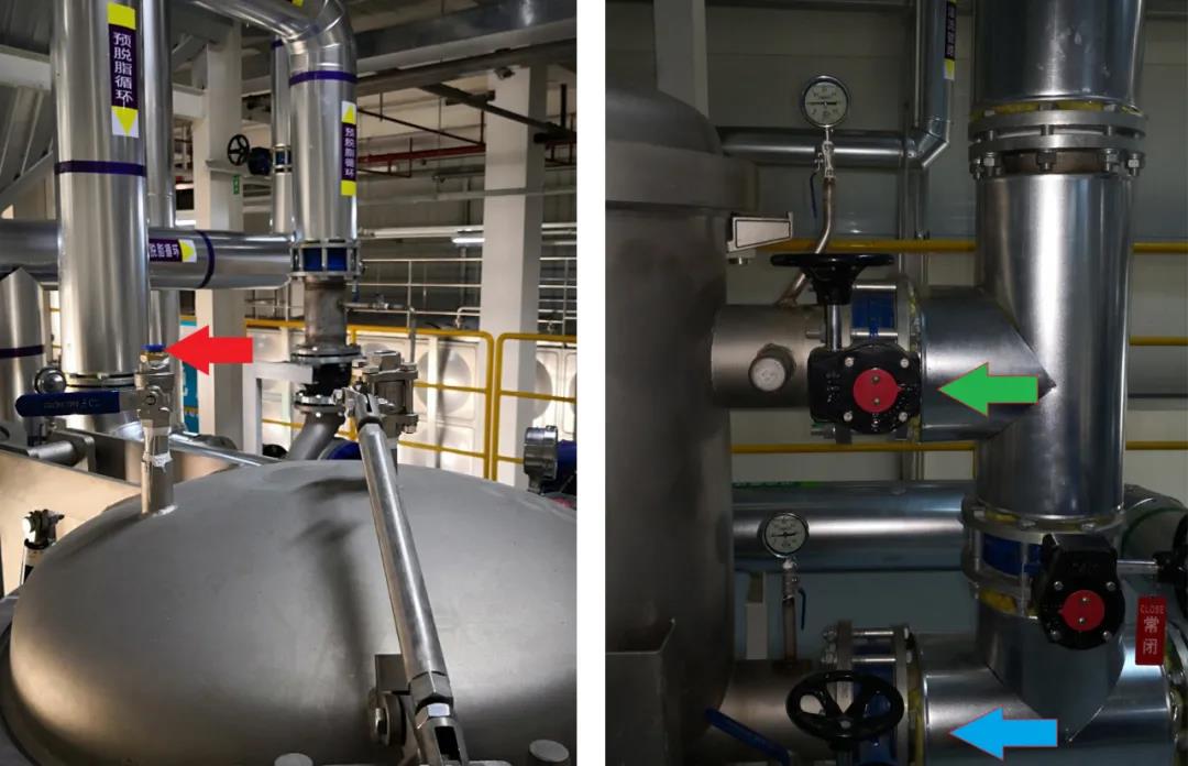 • 检查设备进口(黄色箭头)压力表和出口(紫色箭头)压力表的压差区间在0.5~1公斤,准备更换过滤袋。