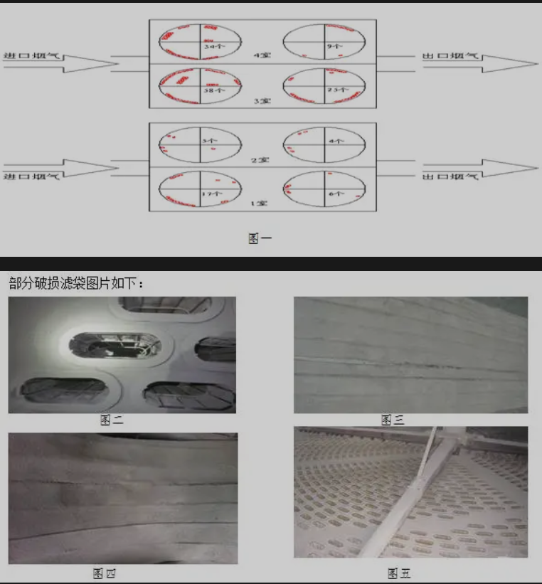 滤袋与袋笼互相磨损导致滤袋出现多处由内向外的破洞及多处竖筋方向的开裂。